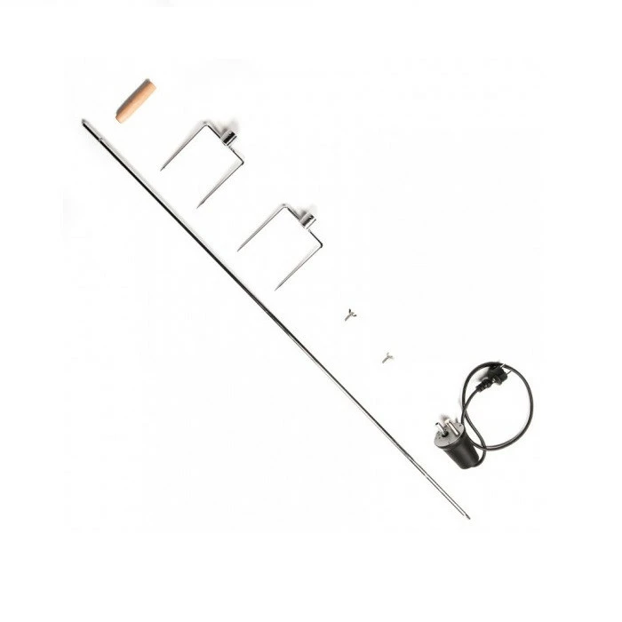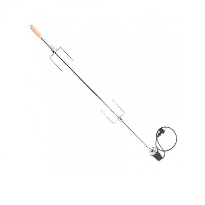 Il comprend une broche en acier chromé avec manche en bois et fourchettes et un moteur électrique à brancher sur 220 volts.