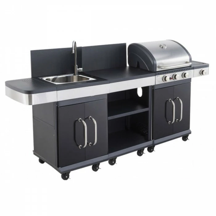 Cette cuisine d’extérieure complète mesure les dimensions suivantes : L 242 × l 57 × H 114cm.