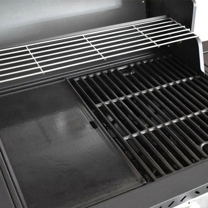 - Une plancha en fonte qui permet à ce barbecue d’avoir 2 fonctions en une seule structure. Très solide, elle est également très facile à nettoyer grâce à son émaillage de qualité.