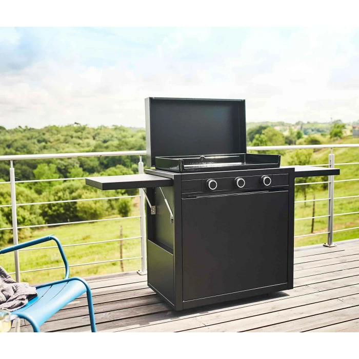 Il est équipé de deux tablettes rabattables avec vérins hydrauliques. Vous pourrez y disposer vos ingrédients et assaisonnements. Si vous optez pour une plancha à gaz, installez la bouteille dans la partie cachée située sous la plancha.